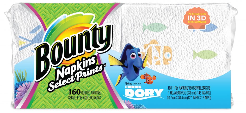 In celebration of Disney•Pixar’s Finding Dory, Bounty’s NEW limited-edition paper towel and napkin prints that allow you to clean up all your unexpected messes and spills, with a little fun from your favorite forgetful fish. Bounty is 2x more absorbent vs. the leading ordinary brand allowing you to tackle big and small messes around the home.