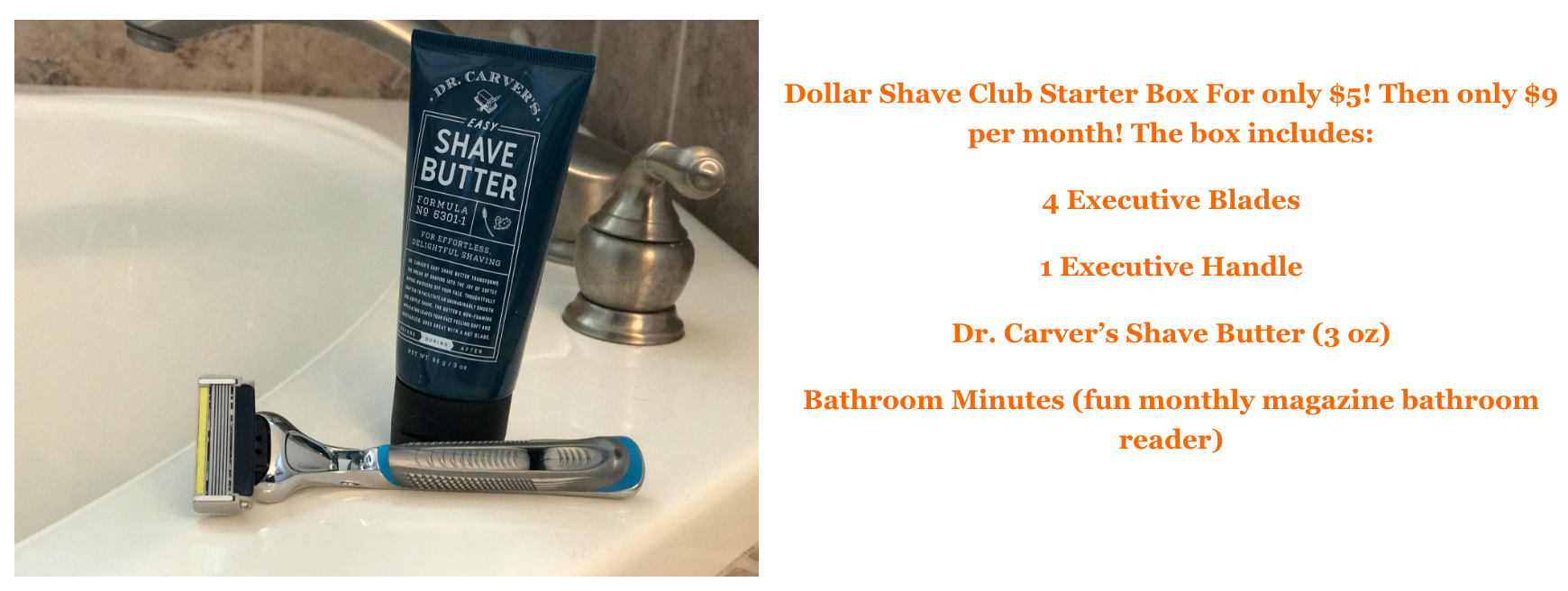 What can you expect from Dollar Shave Club? When you place your first order, you will receive high-quality blades and amazing Dr. Carver’s Shave Butter delivered to your door. I have used both, and they give an incredible, smooth shave. To receive this offer, for a limited time, new members get their 1st month of the Executive Razor with a tube of their Dr. Carver’s Shave Butter for ONLY $5 (valued at $15) with FREE shipping. After that, your razors are just a few bucks a month. Save yourself $10 for just giving it a try.