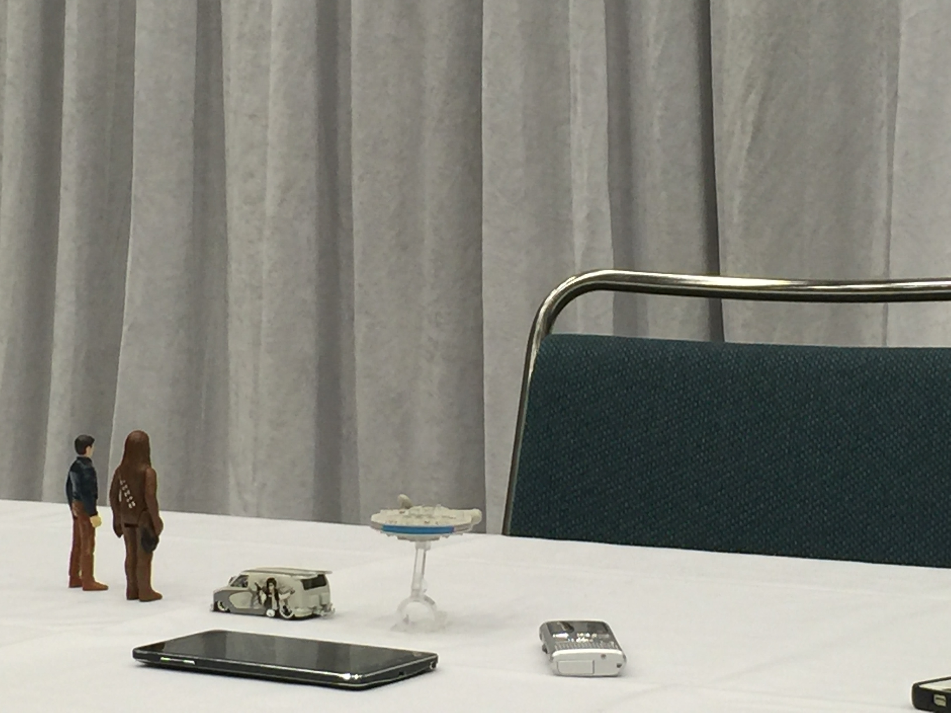 Once he walks in and gets settled, he checks out the toys on the table, sees himself in miniature Han Solo form and lays it face down on the table. We all can’t help but to crack up. Then the interview begins.