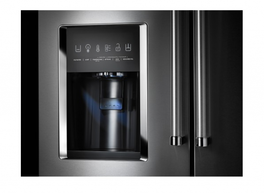 I am loving the middle drawers on this matching refrigerator. The water dispenser along with the double fridge doors are what grabbed my attention. But the space of the whole thing is what wins me over.