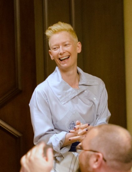 When Tilda Swinton enters a room, people can’t help but stare. She is the most unusually beautiful person and claps right back at us as we applaud her entrance. Her smile is huge, and just like onscreen, her look is mesmerizing. I sat right next to her, and she had little to no makeup on, and her hair is super short, and she pulls it all off perfectly.