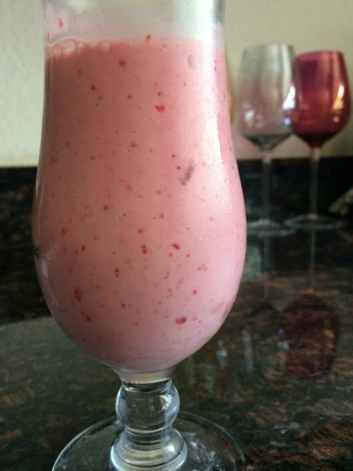 I used one of the Key Lime Yoplait Greek 100 Whips!, about 1/4 of frozen strawberries and just enough vanilla flavored almond milk to help it mix, so maybe 2-3 table spoons.
